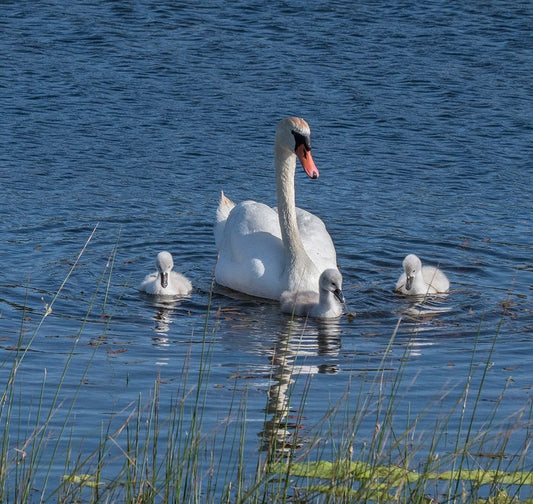 Usa-California A mute swan tends to her cygnets on a California pond White Modern Wood Framed Art Print with Double Matting by Sederquist, Betty