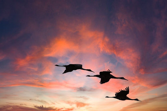 Trio of sandhill cranes settling in for the night. White Modern Wood Framed Art Print with Double Matting by Sederquist, Betty