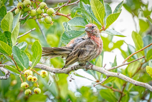 USA-Colorado-Fort Collins Male house finch in a Hawthorne tree White Modern Wood Framed Art Print with Double Matting by Jaynes Gallery