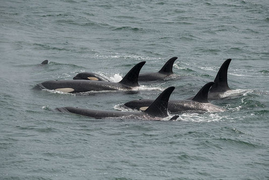 Big pod of orcas in Icy Strait a family unit. White Modern Wood Framed Art Print with Double Matting by Sederquist, Betty