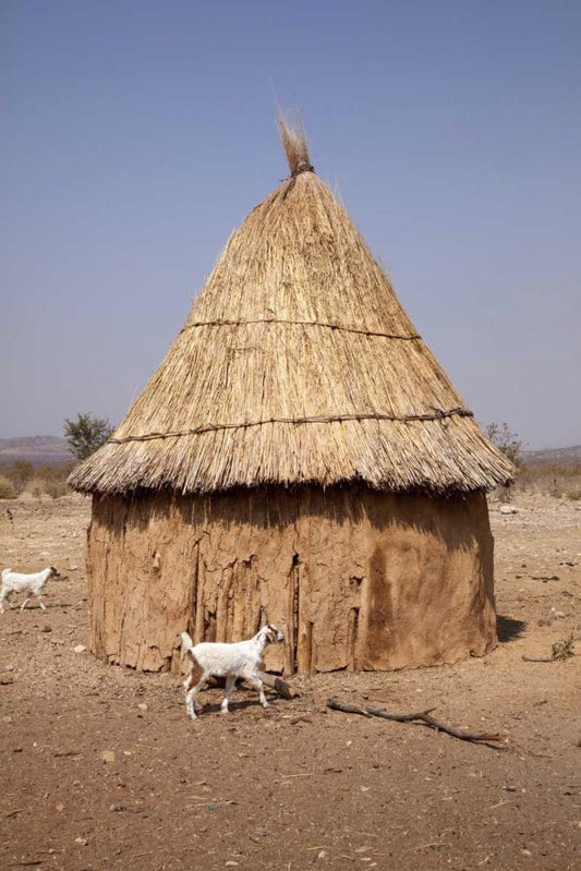 Namibia, Opuwo A pair of goats and Himba mud hut White Modern Wood Framed Art Print with Double Matting by Kaveney, Wendy