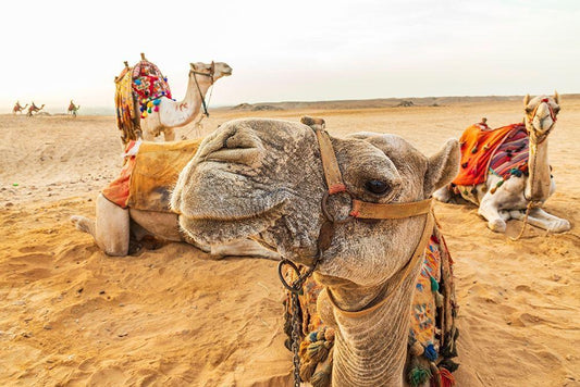 Africa-Egypt-Cairo Giza plateau Camels near the pyramids at Giza White Modern Wood Framed Art Print with Double Matting by Wilson, Emily