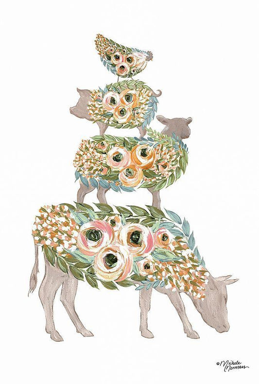 Floral Stacked Animals White Modern Wood Framed Art Print with Double Matting by Norman, Michele