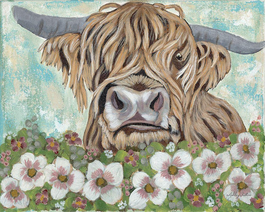 Floral Highland Cow White Modern Wood Framed Art Print with Double Matting by Justice, Ashley