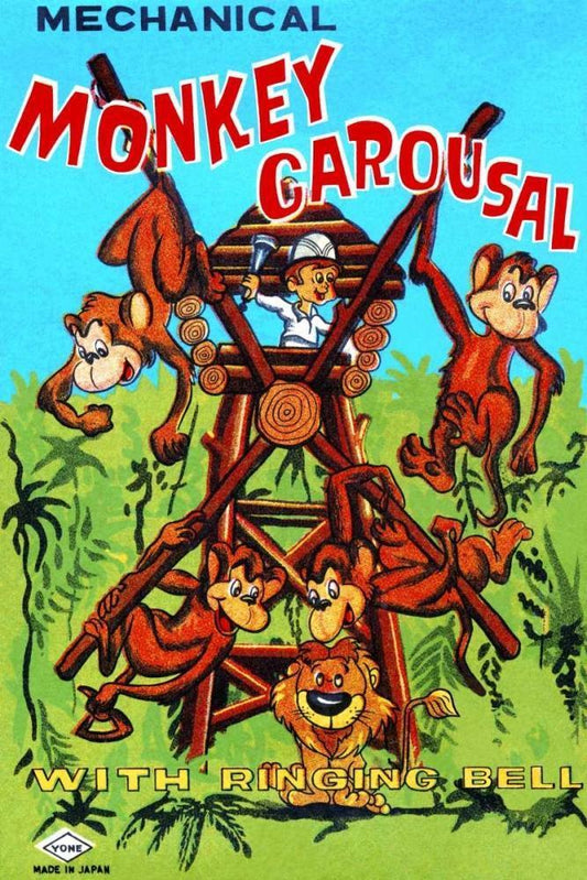 Mechanical Monkey Carousal White Modern Wood Framed Art Print with Double Matting by Retrobot