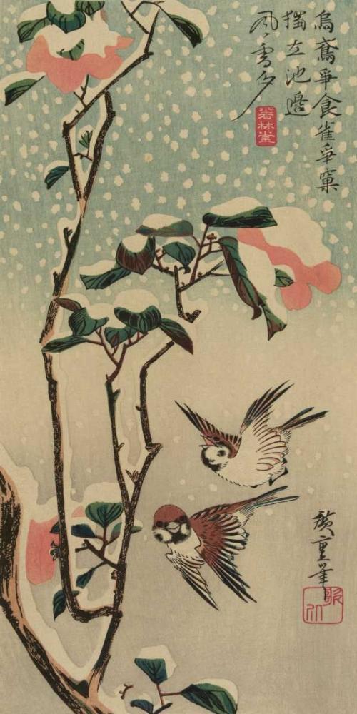 Sparrows and camellias in snow., 1840 White Modern Wood Framed Art Print with Double Matting by Hiroshige, Ando