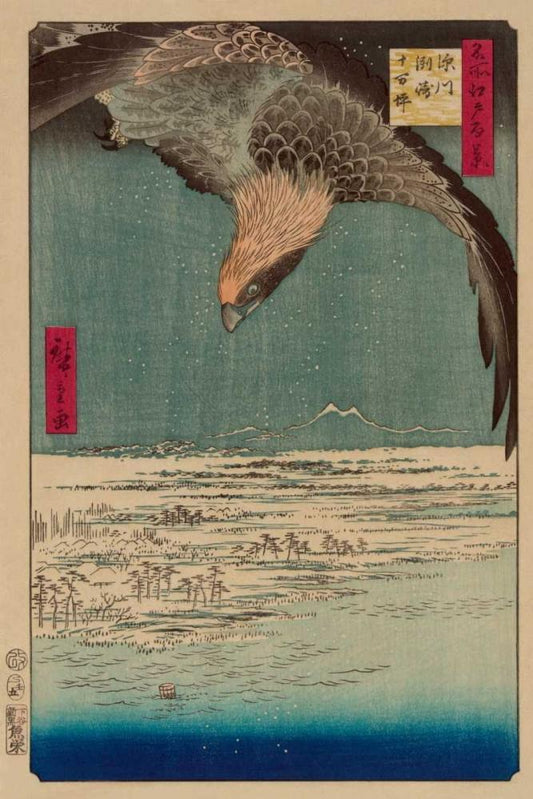 Hawk flying above a snowy landscape along the coastline., 1857 White Modern Wood Framed Art Print with Double Matting by Hiroshige, Ando