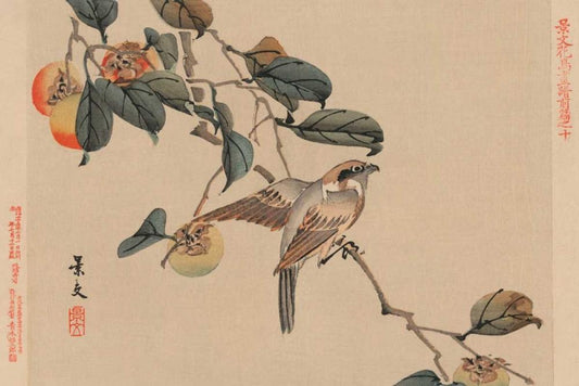 Bird perched on a branch from a fruit persimmon tree., 1892 White Modern Wood Framed Art Print with Double Matting by Matsumura, Keibun
