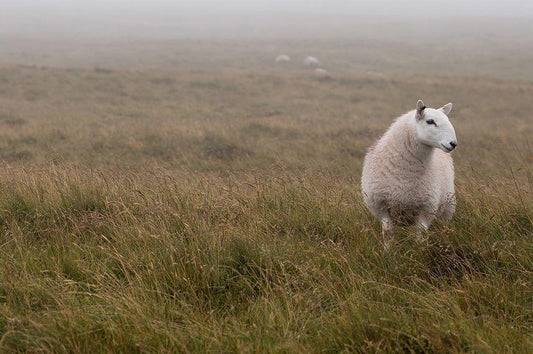 A Sheep standing on grass in mist White Modern Wood Framed Art Print with Double Matting by Frank, Assaf