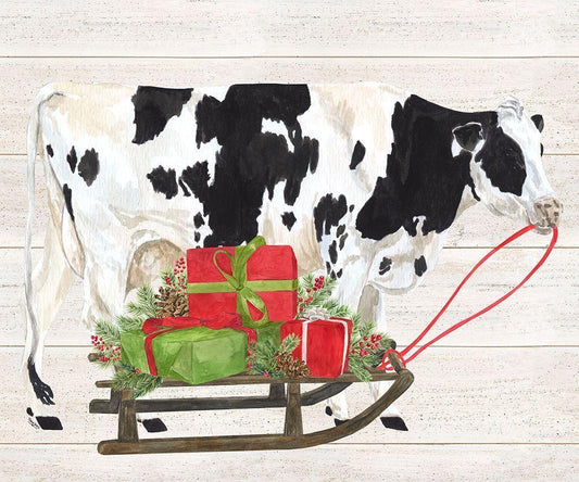 Christmas on the Farm I-Cow with Sled White Modern Wood Framed Art Print with Double Matting by Reed, Tara
