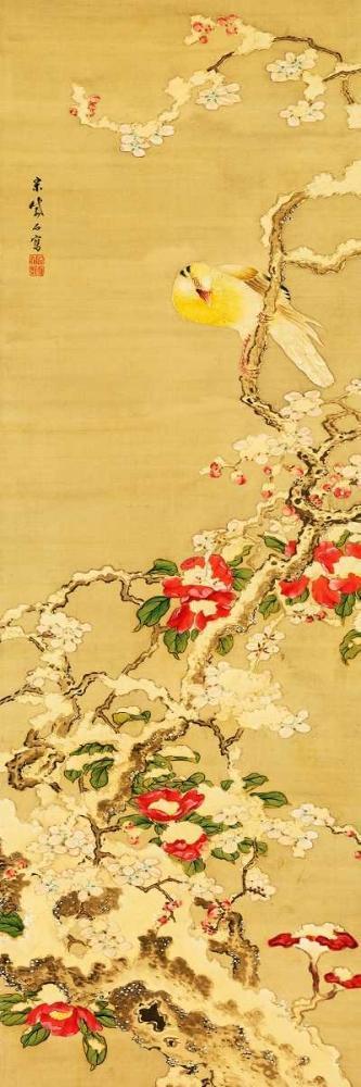 Bird among Camellias in Snow White Modern Wood Framed Art Print with Double Matting by Anonymous