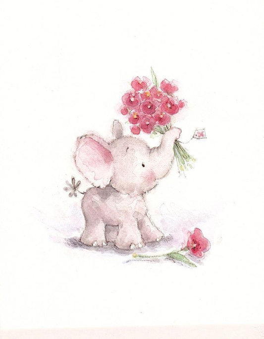 Baby Elephant with Flowers White Modern Wood Framed Art Print with Double Matting by P.S. Art