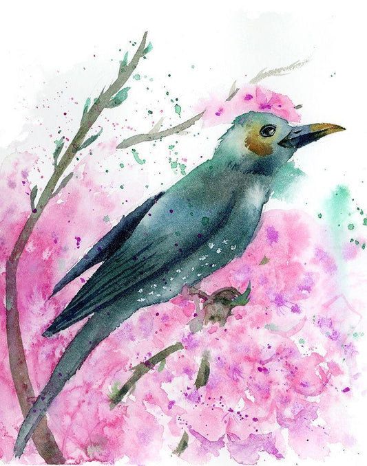 Bird on Branch White Modern Wood Framed Art Print with Double Matting by Shefranov, Olga