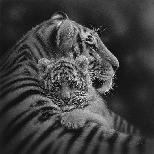 Tiger Mother and Cub - Cherished - BandW White Modern Wood Framed Art Print with Double Matting by Bogle, Collin