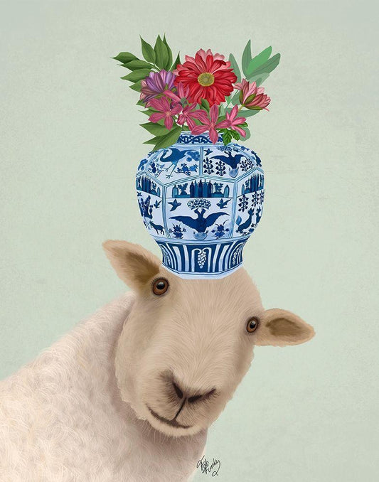 Sheep with Vase of Flowers White Modern Wood Framed Art Print with Double Matting by Fab Funky