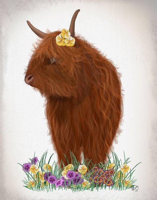 Highland Cow, Pansy White Modern Wood Framed Art Print with Double Matting by Fab Funky