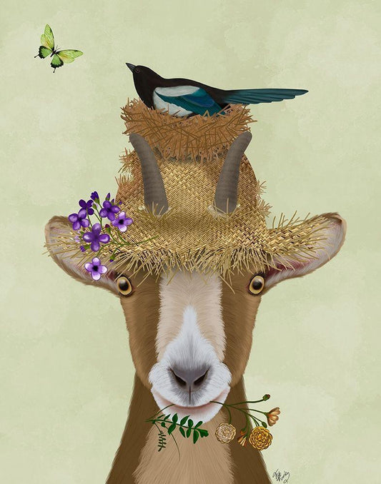 Goat In Straw Hat White Modern Wood Framed Art Print with Double Matting by Fab Funky