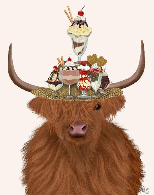 Highland Cow and Ice Cream Hat White Modern Wood Framed Art Print with Double Matting by Fab Funky