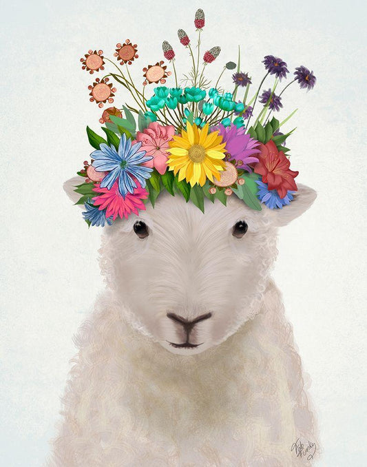 Sheep with Flower Crown 1 White Modern Wood Framed Art Print with Double Matting by Fab Funky