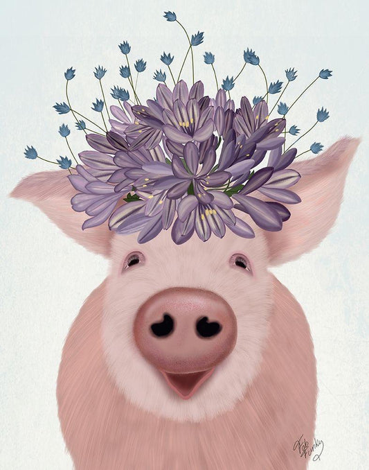 Pig and Lilac Flowers White Modern Wood Framed Art Print with Double Matting by Fab Funky