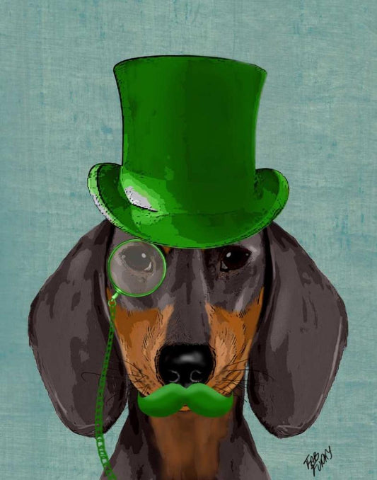 Dachshund with Green Top Hat Black Tan White Modern Wood Framed Art Print with Double Matting by Fab Funky