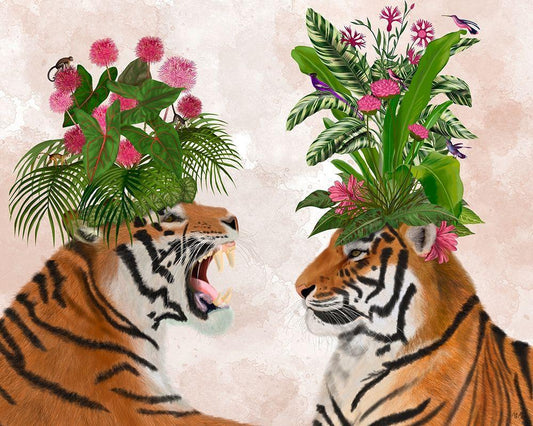 Hot House Tigers, Pair, Pink Green White Modern Wood Framed Art Print with Double Matting by Fab Funky