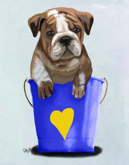 Bulldog Bucket Of Love Blue White Modern Wood Framed Art Print with Double Matting by Fab Funky