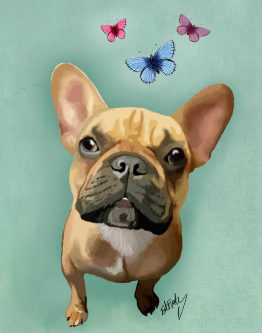Brown French Bulldog and Butterflies White Modern Wood Framed Art Print with Double Matting by Fab Funky