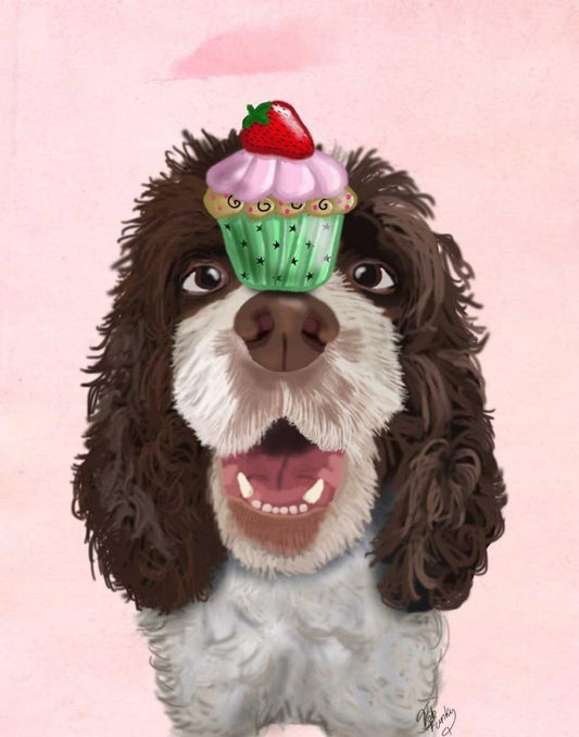 Springer Spaniel with Cupcake White Modern Wood Framed Art Print with Double Matting by Fab Funky