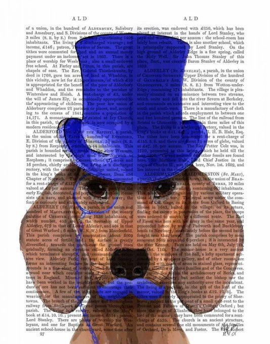 Dachshund With Blue Top Hat and Blue Moustache White Modern Wood Framed Art Print with Double Matting by Fab Funky