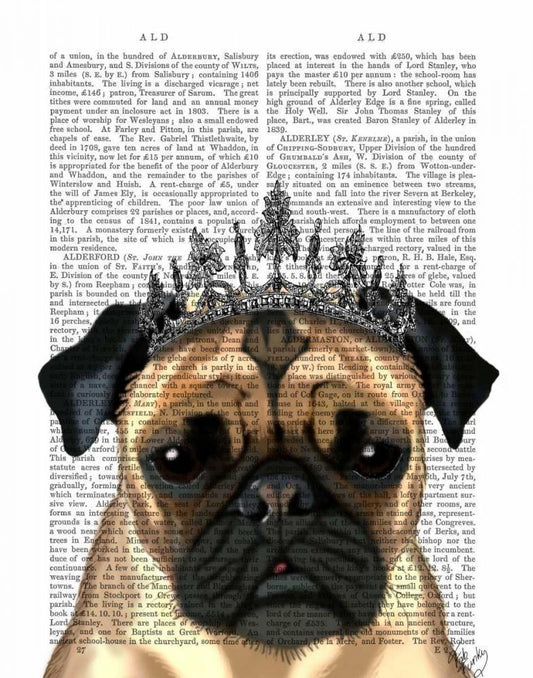 Pug With Tiara White Modern Wood Framed Art Print with Double Matting by Fab Funky