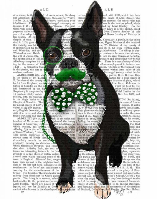 Boston Terrier With Green Moustache And Spotty Green Bow Tie White Modern Wood Framed Art Print with Double Matting by Fab Funky