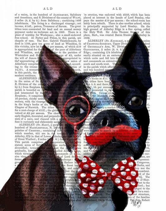 Boston Terrier Portrait with Red Bow Tie and Moustache White Modern Wood Framed Art Print with Double Matting by Fab Funky