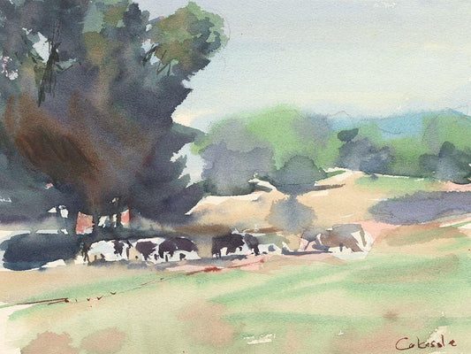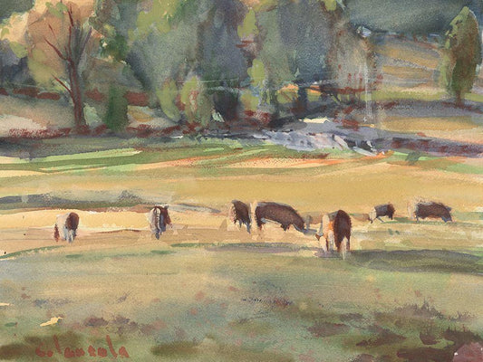 Grazing Cows Watercolor White Modern Wood Framed Art Print with Double Matting by Calcasola, Stephen