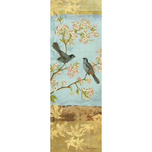 Catbirds and Blooms Panel Gold Ornate Wood Framed Art Print with Double Matting by Gladding, Pamela