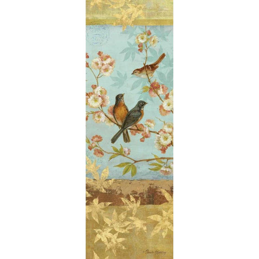 Robins and Blooms Panel Gold Ornate Wood Framed Art Print with Double Matting by Gladding, Pamela
