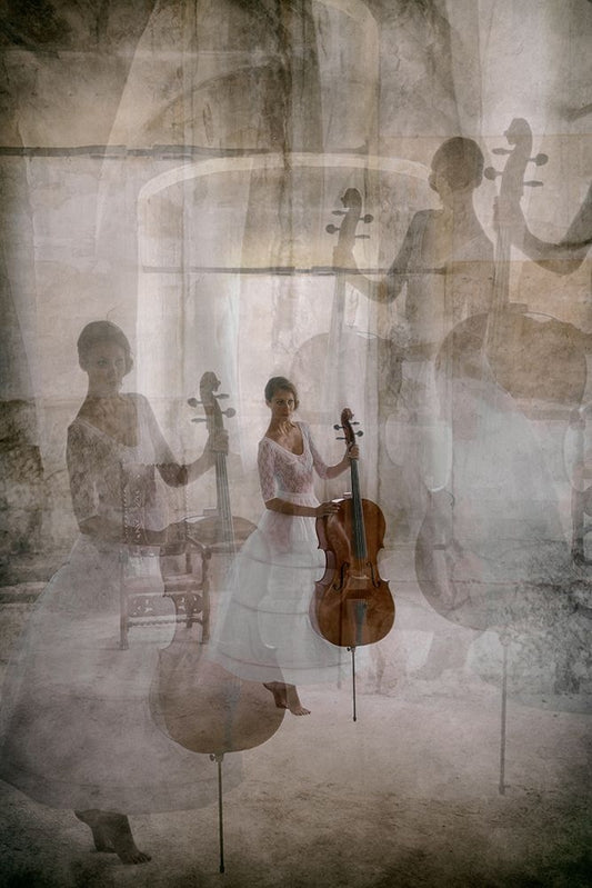 The Stage Fright Of The Cellist White Modern Wood Framed Art Print with Double Matting by Schleicher-Schwarz, Roswitha