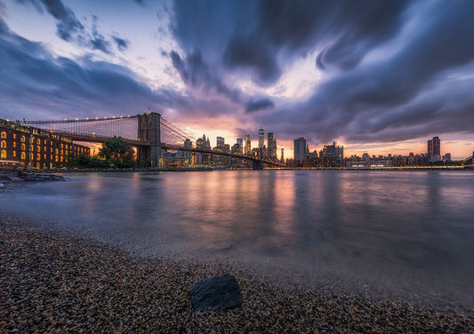 Brooklyn Bridge Lights White Modern Wood Framed Art Print with Double Matting by Schilbe, Stefan