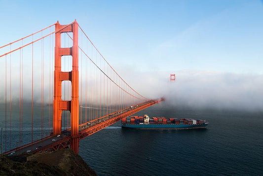 Fog rolls across the Golden Gate Bridge in San Francisco White Modern Wood Framed Art Print with Double Matting by Highsmith, Carol