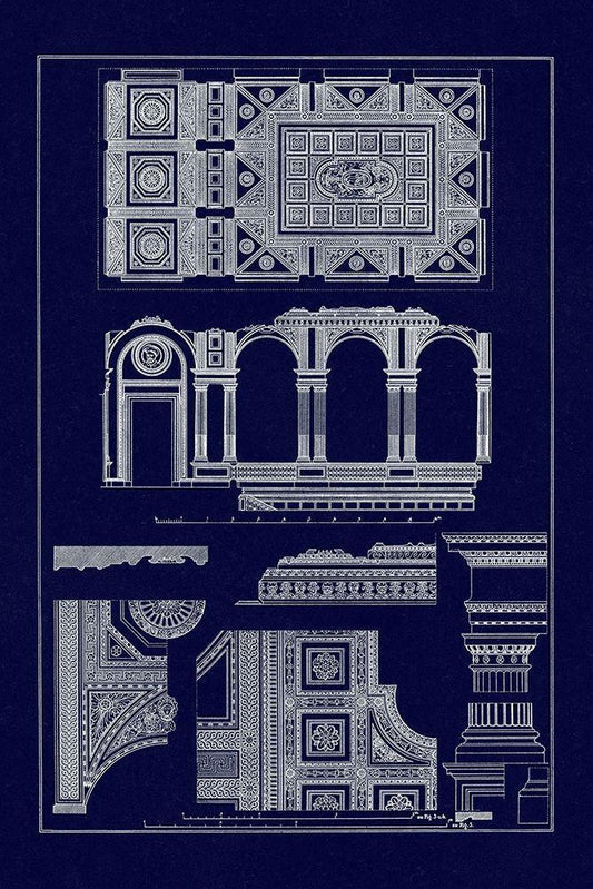 Portico, Coffer and Palmette-Ornament (Blueprint) White Modern Wood Framed Art Print with Double Matting by Buhlmann, J.