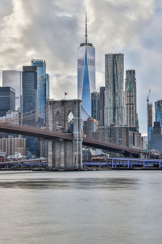 USA-New York The Brooklyn Bridge and New York City skyline Black Ornate Wood Framed Art Print with Double Matting by Looney, Hollice