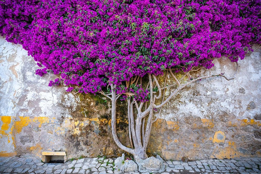 Europe-Portugal-Obidos-Bougainvillea plant on house wall Black Ornate Wood Framed Art Print with Double Matting by Jaynes Gallery