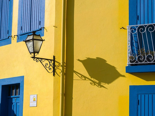 Portugal-Aveiro-Shadow of street lantern on colorful yellow building with bright blue shutters Black Ornate Wood Framed Art Print with Double Matting by Eggers, Julie