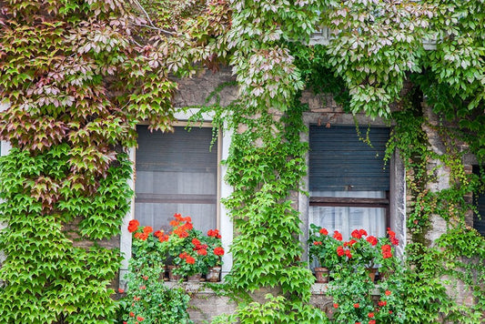 Italy-Venice A pair of windows with red ivy geraniums and ivy climbing the walls Black Ornate Wood Framed Art Print with Double Matting by Eggers, Julie
