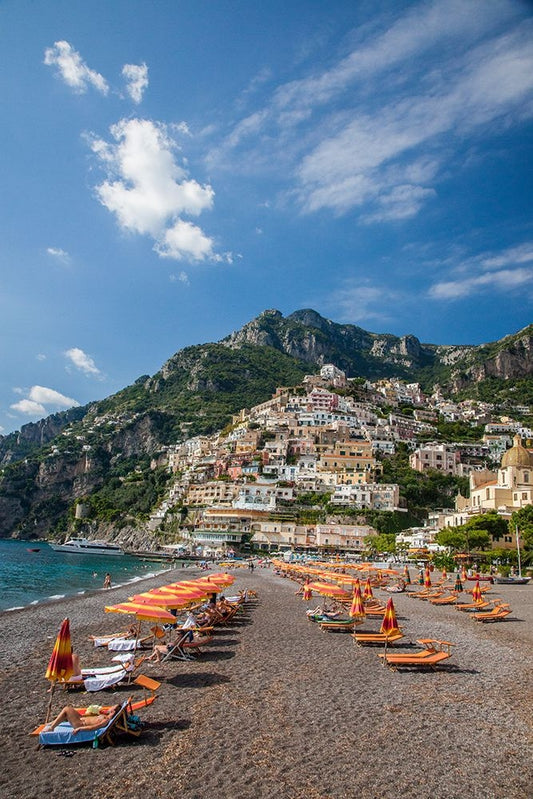 Italy-Positano Beautiful Beach of the Town of Positano with sunbathers Black Ornate Wood Framed Art Print with Double Matting by Eggers, Julie