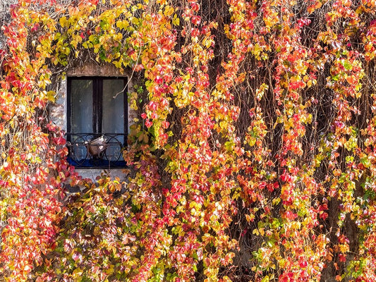 Italy-Tuscany-Monticchiello Red ivy covering the walls of the buildings Black Ornate Wood Framed Art Print with Double Matting by Eggers, Julie