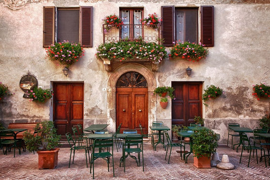 Italy-Tuscany-Pienza Tables and chairs set up outside for outdoor dining in the town of Pienza Black Ornate Wood Framed Art Print with Double Matting by Eggers, Julie
