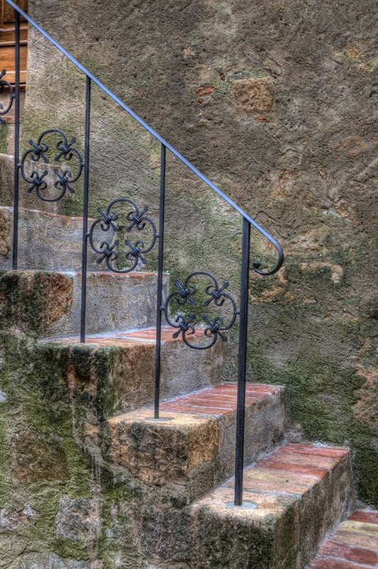 Italy-Tuscany-Pienza Steps with wrought iron railing leading to the entrance to a home in Pienza Black Ornate Wood Framed Art Print with Double Matting by Eggers, Julie