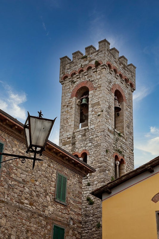 Italy-Radda in Chianti Bell tower of Saint Niccolo church in Radda in Chianti Black Ornate Wood Framed Art Print with Double Matting by Eggers, Julie