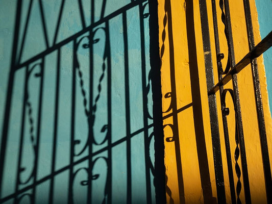 Cuba-Camaguey-UNESCO World Heritage Site-wrought iron gate and colorful walls Black Ornate Wood Framed Art Print with Double Matting by Merrill Images